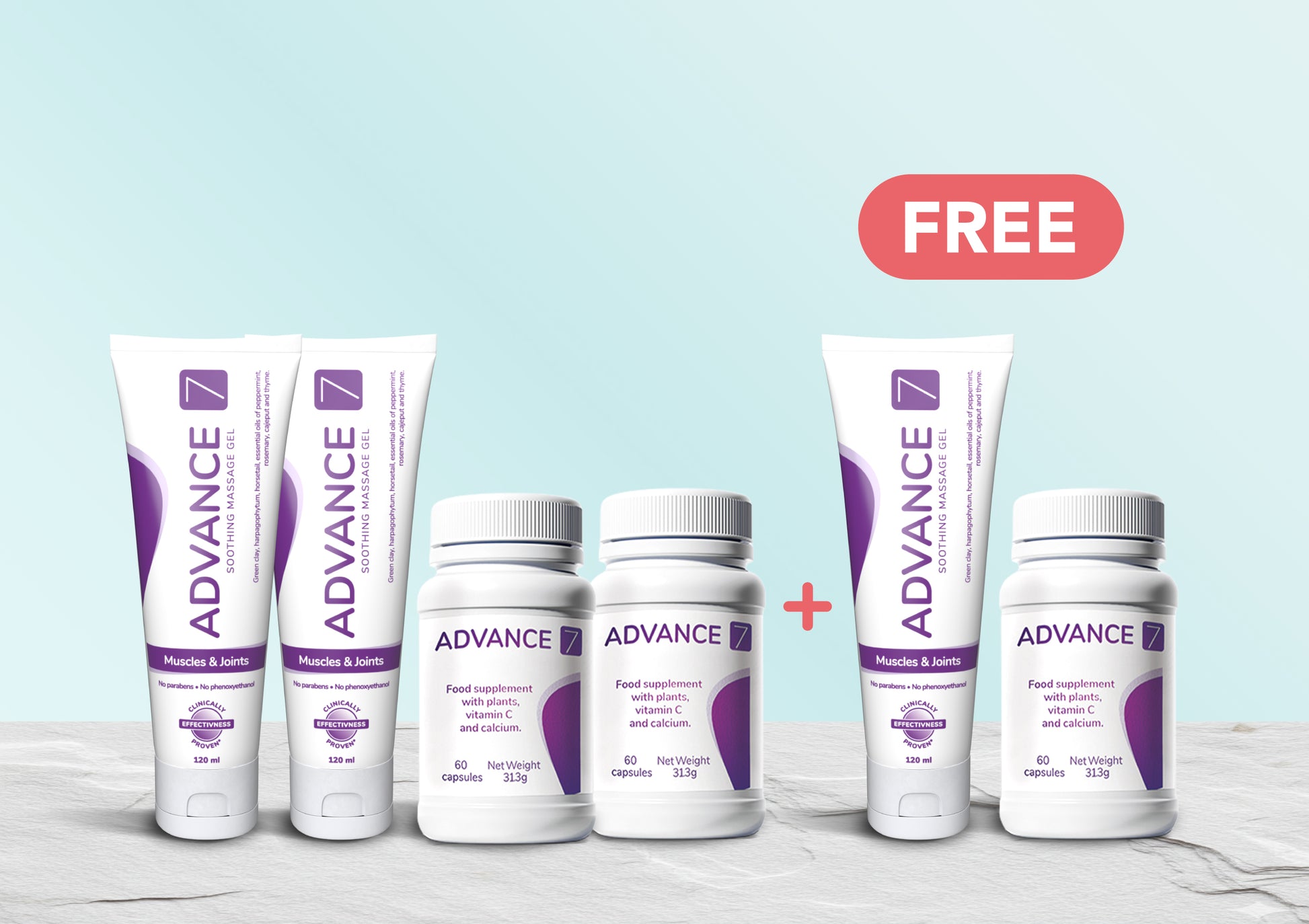 The gel and capsules work in harmony, supporting your joints from the outside and the inside. This programme is also ideal for couples who both use Advance7 and want a convenient shared supply at home.